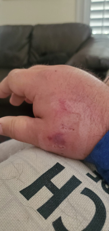 So, this was actually my daughter who bit me. It's a long story but short version... we adopted 2 siblings. They have issues from past trauma. She was having a meltdown and I was holding her trying to calm her down, she clamped down on my hand 4 times. Ended up with a strep infection in my hand that climber to my arm. This photo was 2 or 3 days after and you can see the bite marks including where she got me with her braces. The other photo was actually in the hospital after a couple rounds of IV antibiotics. The infection climbed up my arm and the doc decided to admit me once it got close to my elbow.