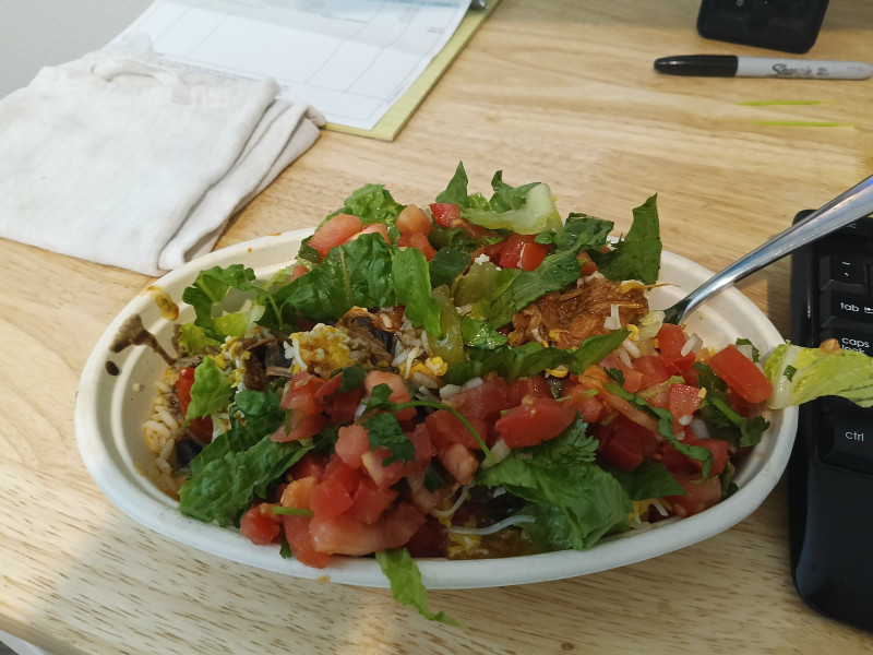 azgreg Sweet pork barbacoa, black beans and rice, roasted veggies, lettuce, pico de gallo, shredded cheese, and roasted tomatillo sauce.
