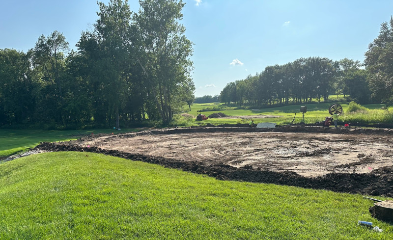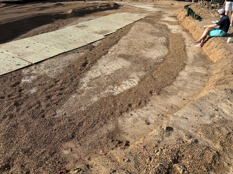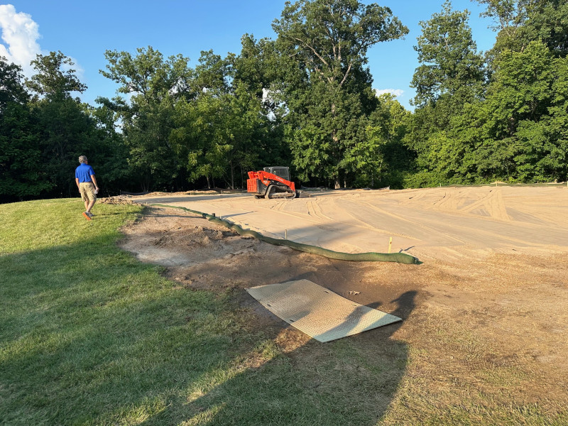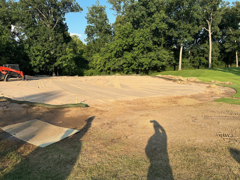 Next was our 13th Green - the drainage and start of the rebuild. You can see the trenches dug for the pipes, and other places where they have been filled already. The fill is carefully selected for how is drains, packs, and resists movement. Its also triple washed to remove any debris that could prevent drainage. You can see portions of the green getting loaded for the next round of shaping. 4" of fill this round.