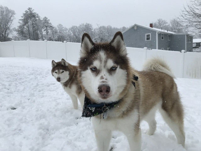 Yipsy Yes we had 4. Sadly we lost one in July and another in September. Spike is 11 and Varitek is also in the background in the picture and he is 15. Varitek is on alot of meds, has good days and not so good days. Ozzy we got from our breeder/sled dog person as a pup. Varitek we got from her when he was 4 and she retired him from the sled team. He was the Captain. Spike was a rescue from our town…. Animal control knew we were part of a Husky Rescue and had a family that couldn’t handle him… he was 2. We took him in… ended up keeping him because the people were so happy he was going to us with the other dogs. Charger was also a retired sled dog.