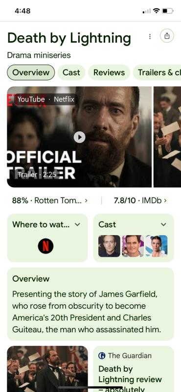 About the lead up to the election and assassination of President James Garfield. Will watch the last episode tonight. Very well done with good acting.