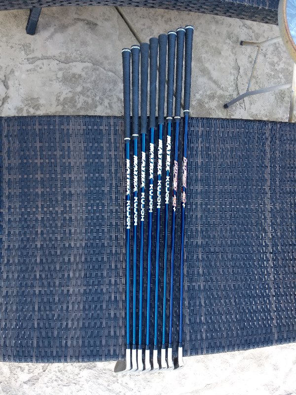 SVonhof I built these up to try and they do work great, but I wanted something different. Dynacraft Prophet Cavity Back 4-7 and Muscle Blade 8-PW mixed set with stiff shafts. Used for maybe 3 rounds and a few hit at the range as well. The 6 doesn't even look to have been hit. Got the shafts from a member on here and didn't swap the grips on those that had them, so they don't all match, but I can swap those so they do match before shipping if the buyer wants. Edit: Images show the 3-iron as well, but I am keeping that right now. **Edit: Looking for $50 + shipping